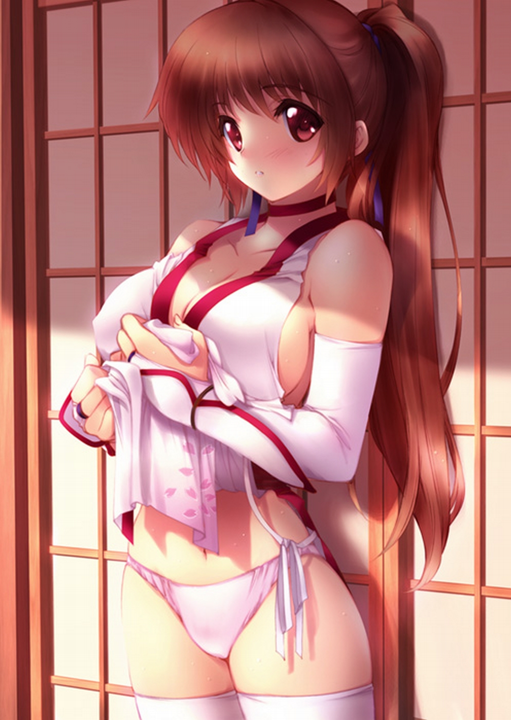1girlagainst wallblushbreastsbridal gauntletschokerclothes liftfemale focuslarge breastslong hairnavelpantiespelvic curtainpink pantiesponytailskirtskirt liftsolothighhighsunderwear