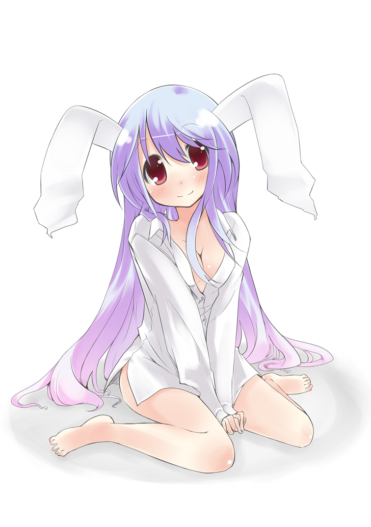1girlanimal earsbarefootbottomlessbreastscleavagefeetfemale focuslong hairpurple hairrabbit earsred eyesshirtsittingsmilesolov armswarizawhite shirt
