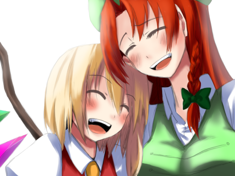 2girlsblonde hairblushbowbraidclosed eyesfemale focushair bowhatlaughingmultiple girlsno headwearopen mouthred hairtwin braidsupper bodywings