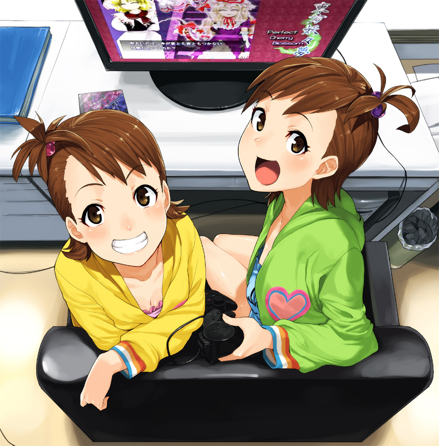 :d00s2girlsbrown eyesbrown haircasualcontrollercrossoverdownblouseflipped hairgame consolegame controllergrinhair bobbleshair ornamentlooking at viewerlooking backmultiple girlsopen mouthplaying gamesplaystation 2short hairsiblingsside ponytailsisterssittingsmiletouhou user interfacevideo game