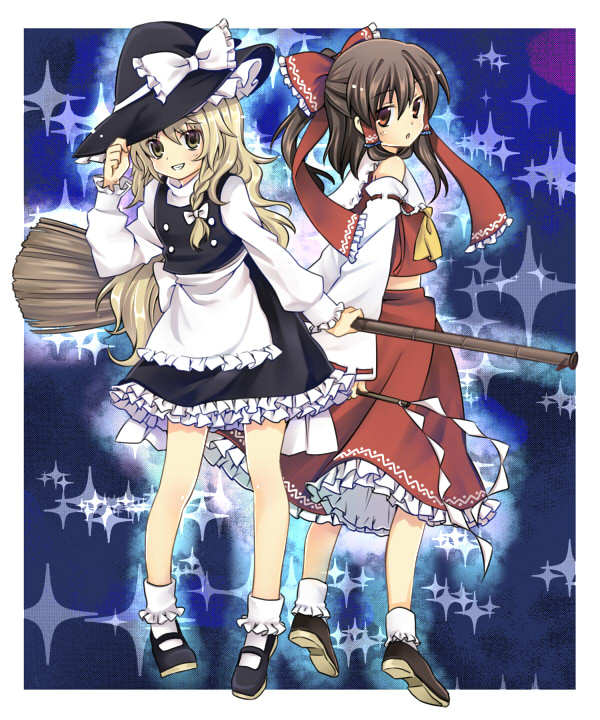 2girlsbamboo broomblonde hairbobby socksbowbraidbroombrown hairdetached sleevesfemale focusfrillsgoheigrinhair bowhair ribbonhathat tipjapanese clotheslooking backmary janesmikomultiple girlsribbonshoesshort hairside braidsmilesockssparklewitchwitch hatyellow eyes