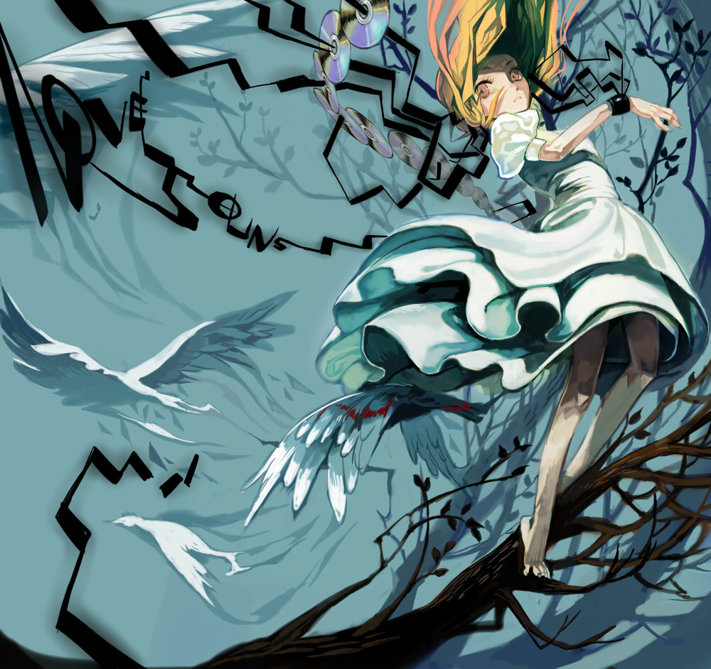 1girlbarefootbirdblonde hairblue backgroundbreastscddressfeetfemale focusfloating hairflyingfull bodygradient hairin treelong hairlooking at viewermatching hair/eyesmulticolored hairorange eyesorange hairoutdoorsparted lipspuffy short sleevespuffy sleevesshort sleevessmall breastssolostandingtreewhite dresswristbandyellow eyes