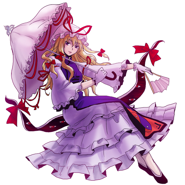 1girlblonde hairfemale focusfull bodygap (touhou)gloveshair ribbonhatlong hairpurple eyesribbonshort hairsimple backgroundsoloumbrellawhite background