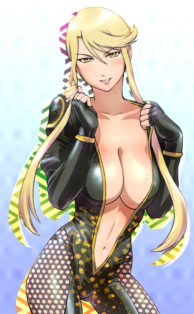 00s1girlbare hipsblonde hairbreastscenter openingcleavagefemale focusfingerless glovesfishnetsgloveslarge breastslong hairnavelninjashadowsmilesoloyellow eyes