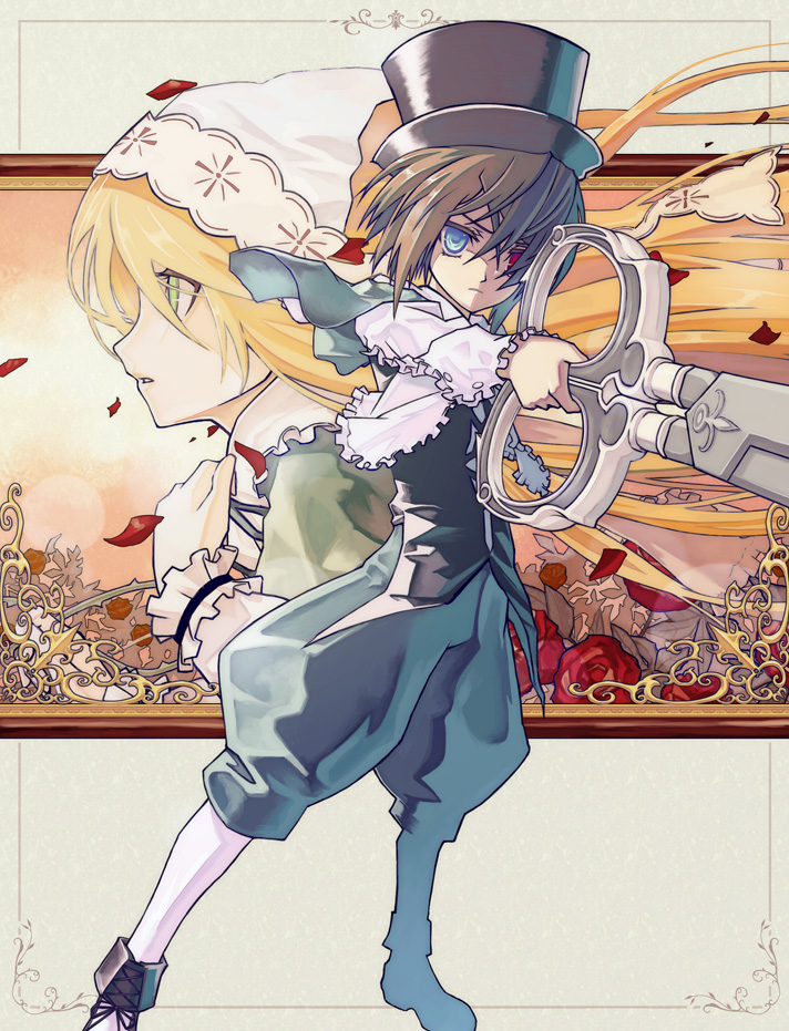 00s2girlsbrown hairflowerfrillshairbandhatheadscarfheterochromialong hairmultiple girlspantyhoserosescissorsshort hairsiblingssisterstwinswhite headscarf