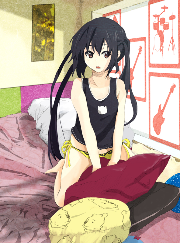 00s1girlbarefootbedblack hairbrown eyesfemale focusgibson les paulindoorslong hairmustang (guitar)pantiespillowside-tie pantiessolotank toptwintailsunderwear