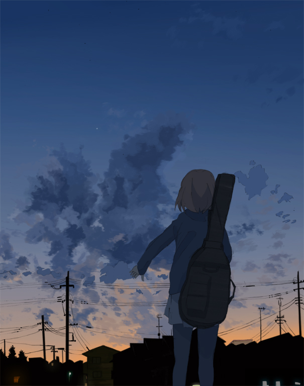 00s1girlbrown haircloudfemale focusguitar caseinstrument caseoutdoorspantyhosepower linessceneryschool uniformshort hairskirtskysolosunset