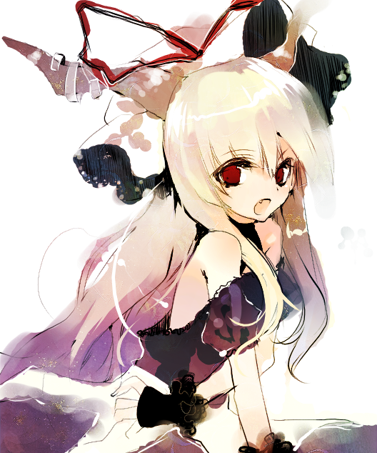 1girlalternate costumebare shouldersblonde hairbowfangfemale focusfingerless glovesgloveshair bowhornsred eyessimple backgroundsketchsolowhite background