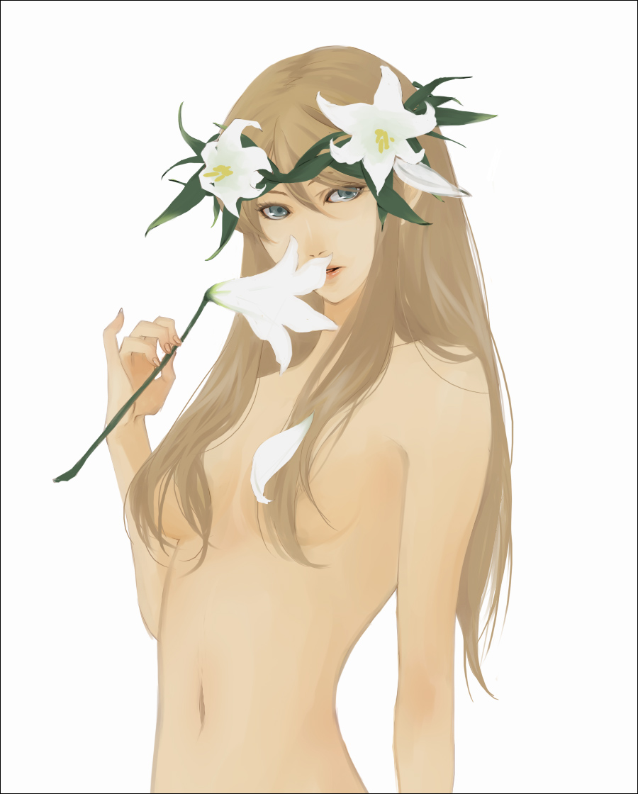 1girlblue eyesbrown haircensoredconvenient censoringeyelashesfemale focusflowergreen eyeshair between eyeshair censorhair flowerhair ornamenthair over breastslong hairnavelnuderealisticsimple backgroundsmellingsmelling flowersolowhite background