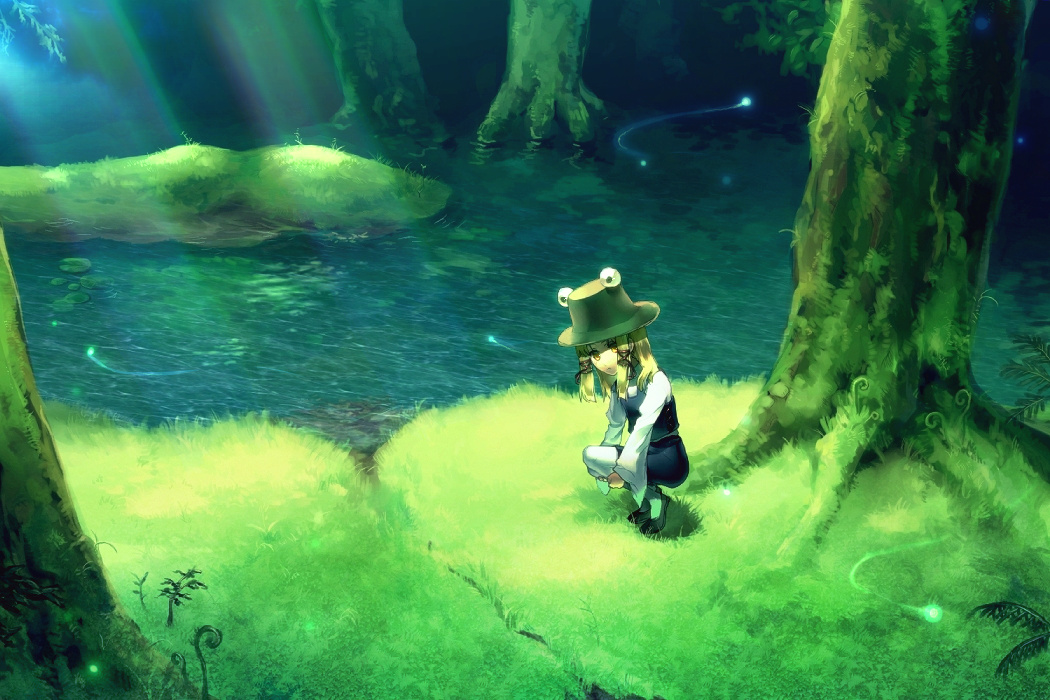 1girlblonde hairbrown hatfemale focusfirefliesgrassgreen themehatnaturescenerysolosquattingsunlighttreewateryellow eyes