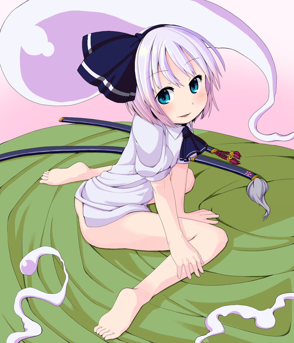 1girlbarefootblue eyesbottomlessfeetfemale focusghosthairbandkatanasheathsheathedshort hairsittingsmilesolessoloswordtoeswarizaweapon