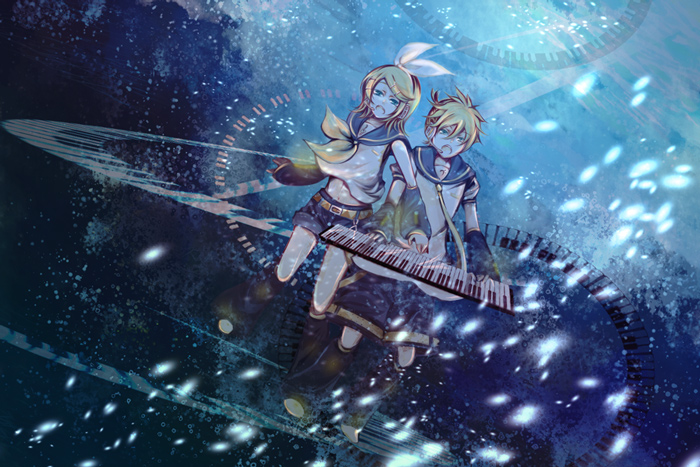 1boy1girlblonde hairblue eyesbrother and sisterhair ornamenthair ribbonhairclipnecktieopen mouthribbonshort hairshortssiblingstwins