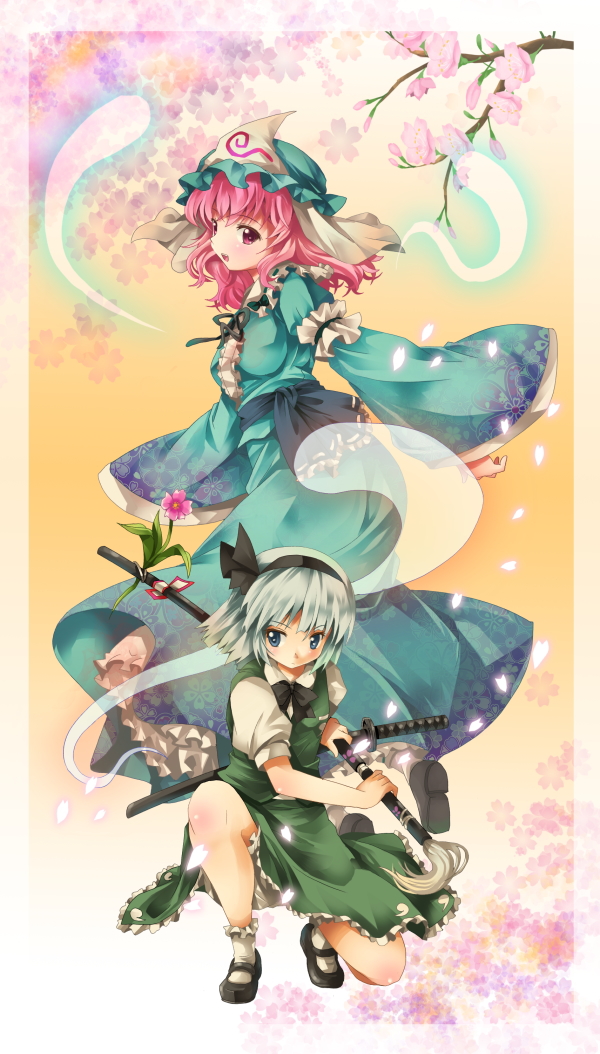 2girlsblue eyesfemale focushairbandhathitodamakatanamary janesmultiple girlspetalspink eyespink hairshoesshort hairswordweapon