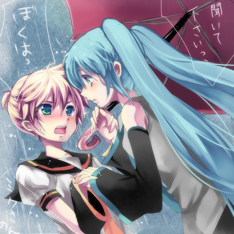 1boy1girlaqua eyesaqua hairblonde hairblushcoupledetached sleevesheteroholding handslong hairrainshort hairsiblingstwintailsumbrella