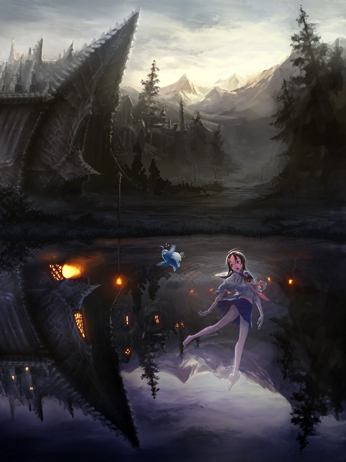 1girlbarefootbirdbrown hairfemale focuslakelandscapemountainnavelreflectionreflective watersceneryschool uniformserafukushort hairskysolowater