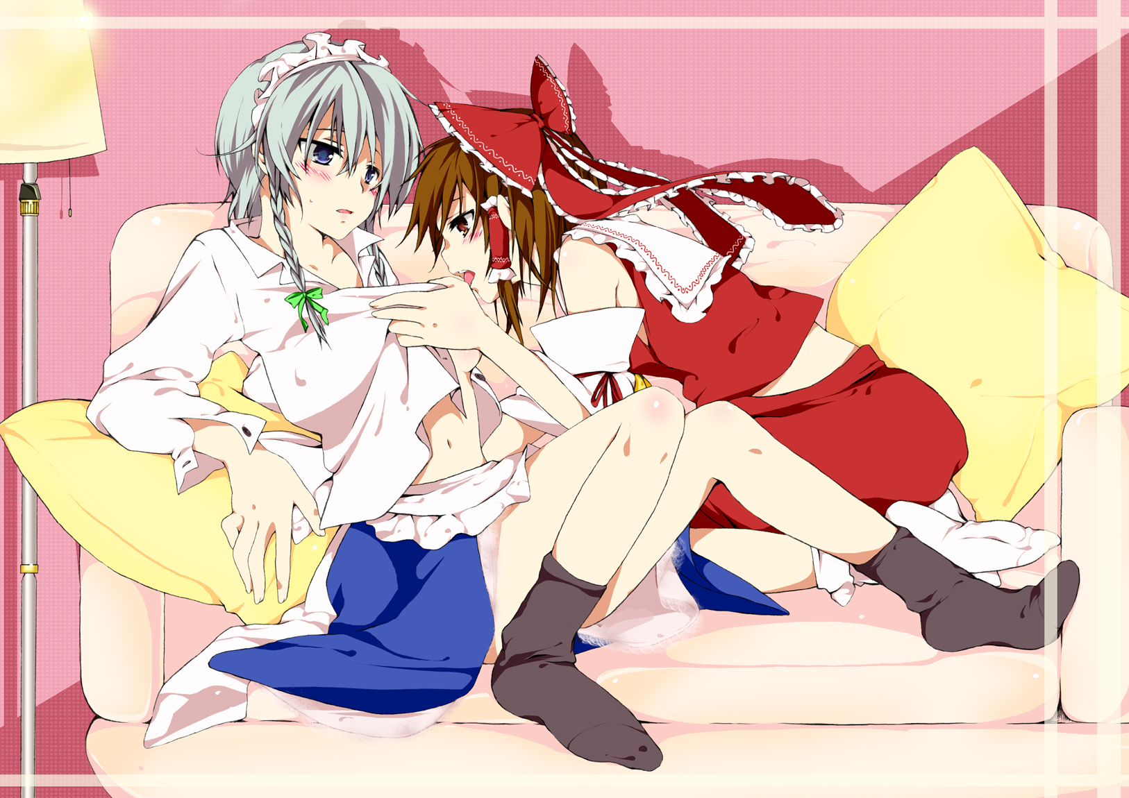 yuikisezu, jinshi (kusuriya no hitorigoto), maomao (kusuriya no hitorigoto), kusuriya no hitorigoto, highres, 1boy, 1girl, alcohol, apple, arm around waist, biting, black choker, black pants, blue eyes, blunt bangs, braid, breasts, candlestand, choker, couple, cup, dress, dress flower, drinking glass, earrings, falling petals, flower, food, fruit, furrowed brow, grapes, hair over shoulder, hand in another's hair, hand on another's chest, hetero, jewelry, juliet sleeves, long dress, long hair, long sleeves, medium breasts, neck biting, off-shoulder dress, off shoulder, one eye closed, open mouth, pants, petals, puffy long sleeves, puffy sleeves, red dress, red flower, red petals, red rose, red wine, rose, shirt, single braid, vampire, white background, white shirt, wine, wine glass