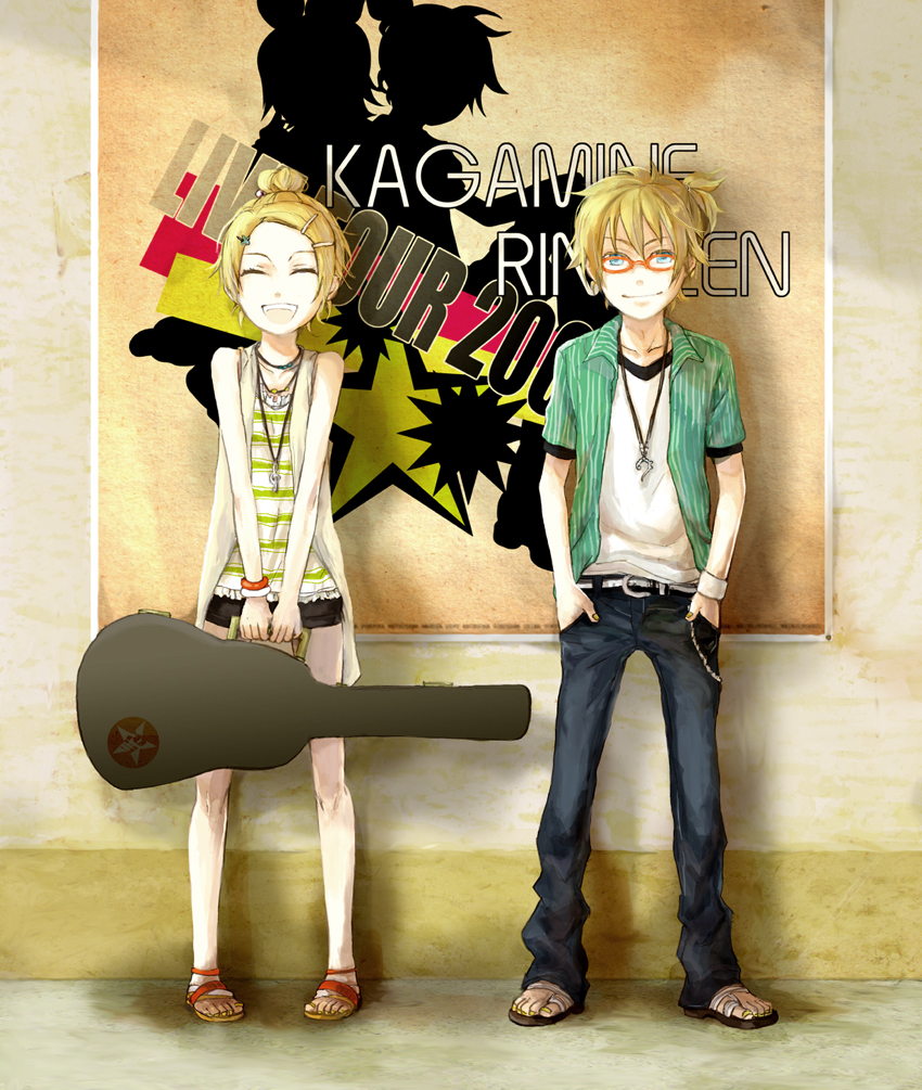 1boy1girlalternate hairstyleblonde hairblue eyesbrother and sistercasualclosed eyesguitar casehair ornamenthaircliphands in pocketsinstrument caseminiskirtshort hairsiblingsskirtsmiletwins