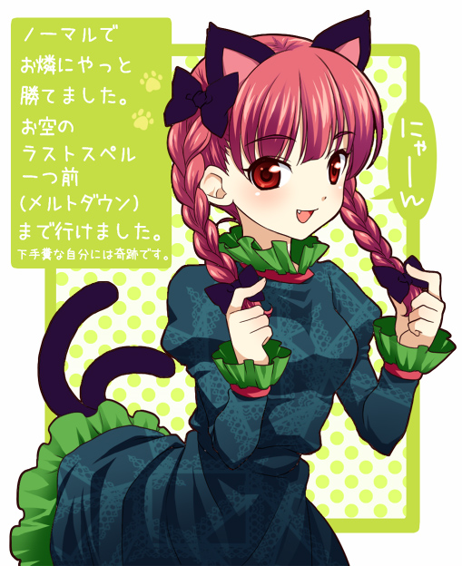 1girlanimal earsbraidcat earscat girlcat taildressextra earsfangfemale focushair ribbonmultiple tailsnyanred eyesred hairribbonsmilesolotailtwin braids