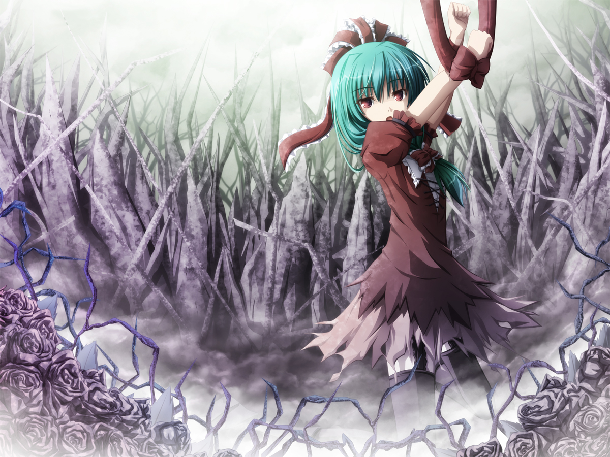 1girlbdsmbondageboundfemale focusflowerfront ponytailgreen hairhair ribbonred eyesribbonribbon bondagesolothighhighstorn clothes