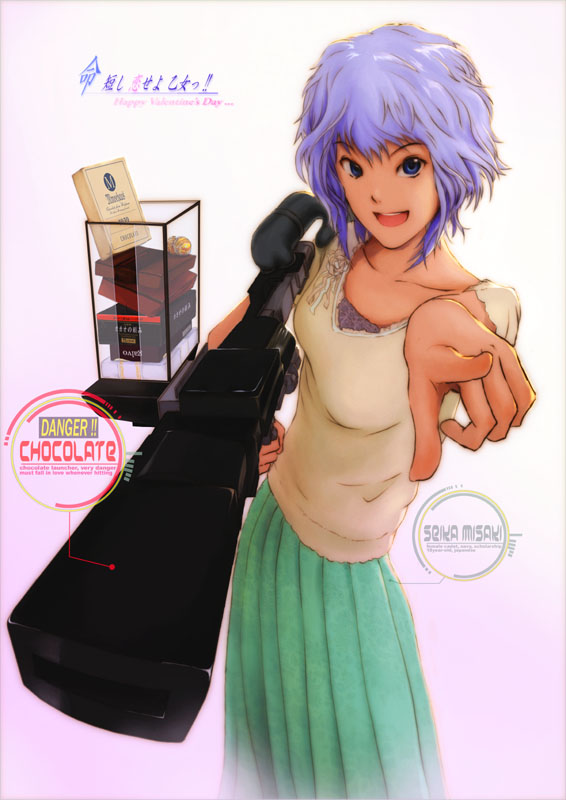 1girlblue eyesblue hairchocolatefemale focusforeshorteninggunhappy valentinem1 bazookamatching hair/eyespointingriflerocket launchersmilesolovalentineweapon