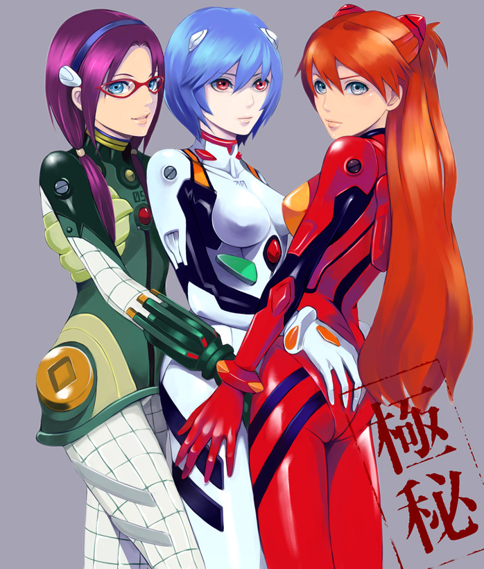 00s3girlsassblue eyesblue hairbodysuitbreastsfemale focusgirl sandwichglasseshairbandlarge breastslipslong hairlooking backmecha pilot suitmultiple girlsorange hairplugsuit (evangelion)purple hairred eyessandwichedshort hairskin tightsmiletwintails