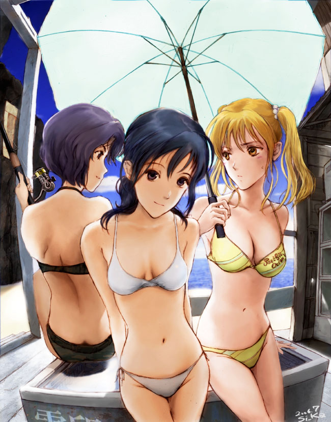 3girlsbackbikiniblonde hairbreastscleavagecoolerfisheyefishing rodfrom behindlarge breastsmultiple girlspurple hairshort hairsittingsmileswimsuittwintailsumbrellayellow eyes