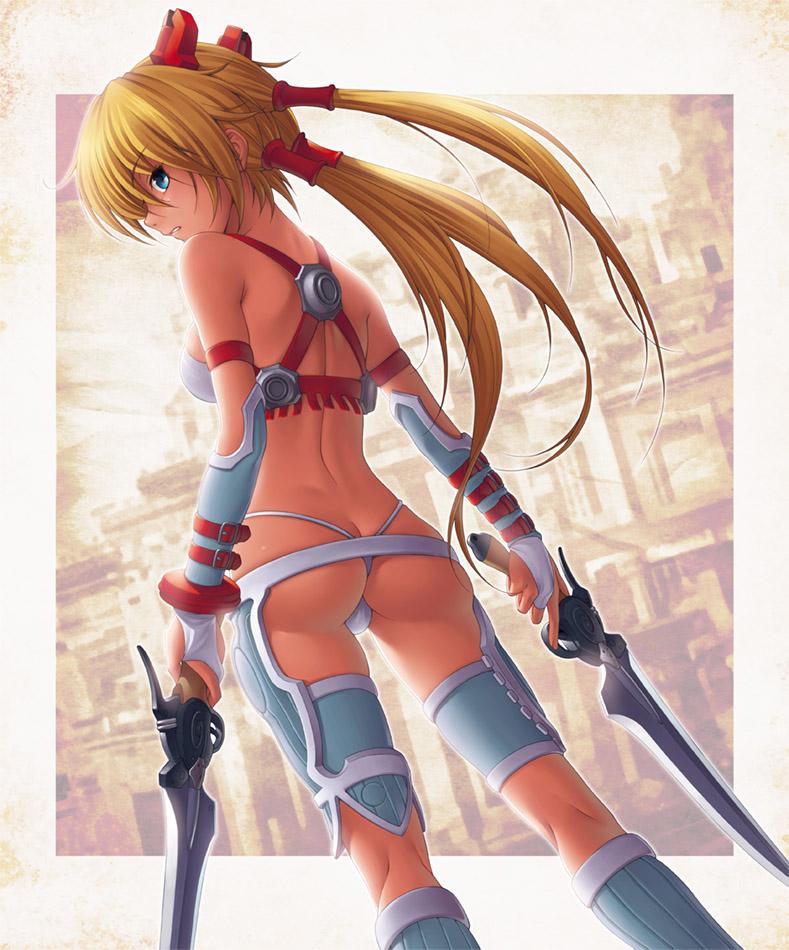 1girlassbackbare shouldersblonde hairblue eyesbreastsbridal gauntletsbutt crackdual wieldingfemale focusfrom behindglovesgunbladehands on own hipsholdinglong hairlooking backpantiessoloswordtanthongtri tailstwintailsunderwearvery long hairweapon