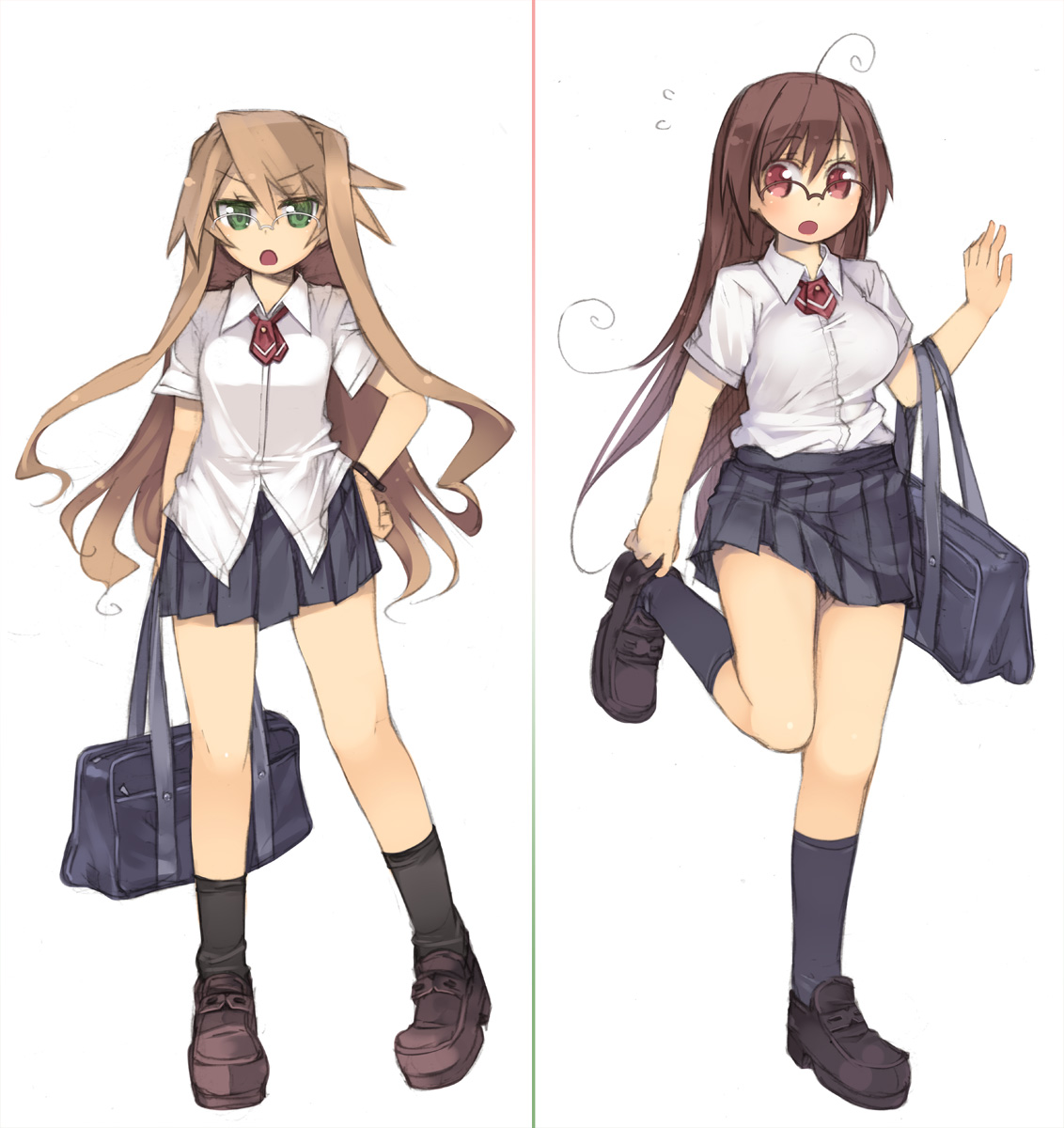 :o2girlsahogebagblack socksblonde hairbrown hairglassesgreen eyeshand on own hiphands on own hipship focuslong hairmultiple girlsnecktiered eyesschool bagschool uniformshoesshoulder bagsiblingssisterssocks