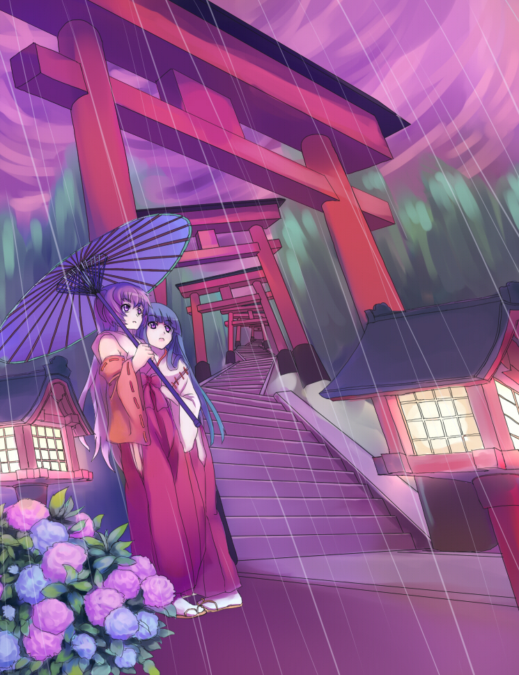 00s2girlsblue hairdetached sleevesflowerhakamahakama skirthornshydrangeajapanese clotheslanternlong hairmikomultiple girlsmultiple toriioil-paper umbrellapurple eyespurple hairrainred hakamashared umbrellaskirtstairstoriiumbrella