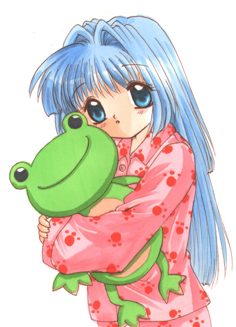 1girlblue eyesblue hairdollfemale focusfroghugging dollhugging objectmatching hair/eyespajamaspaw printprint pajamassimple backgroundsolostuffed animalstuffed frogstuffed toywhite background
