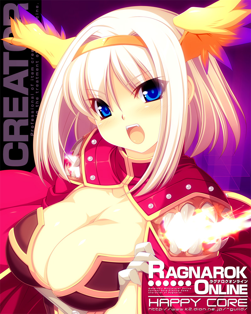 1girlarmorblue eyesblushbreastscharacter namecleavagecopyright nameenergyfangsfemale focusgloveshairbandhead tilthead wingslarge breastslooking at vieweropen mouthshort hairsoloupper bodywatermarkweb addresswhite hairwings