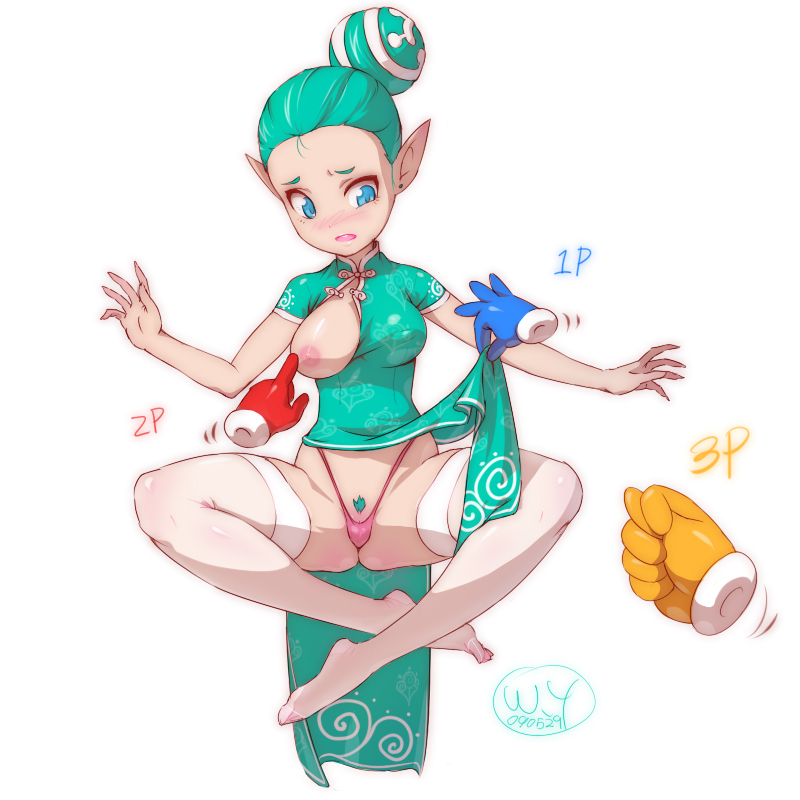 1girlblue eyesblushbreast slipbreastschina dresschinese clothesclothes liftdressdress liftearringsfeetfemale focusfemale pubic hairgreen hairjewelrylarge breastsnipplesone breast outpointy earspokingpoking another's breastpubic hairskirtskirt liftsolothighhighstoeswardrobe malfunctionwhite thighhighs