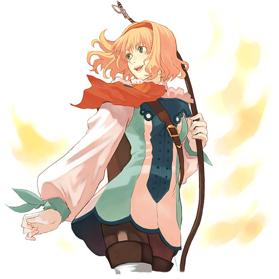 00sascotblonde hairbootsbow (weapon)glovesgreen eyeshairbandorange ascotpantyhosescarfshort hairsmilesolothigh bootsthighhighsweapon