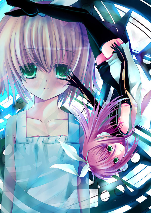 2girlsaged downdresselbow glovesglovesgreen eyeshair ornamenthairclipmultiple girlspurple hairsailor dressthighhighs