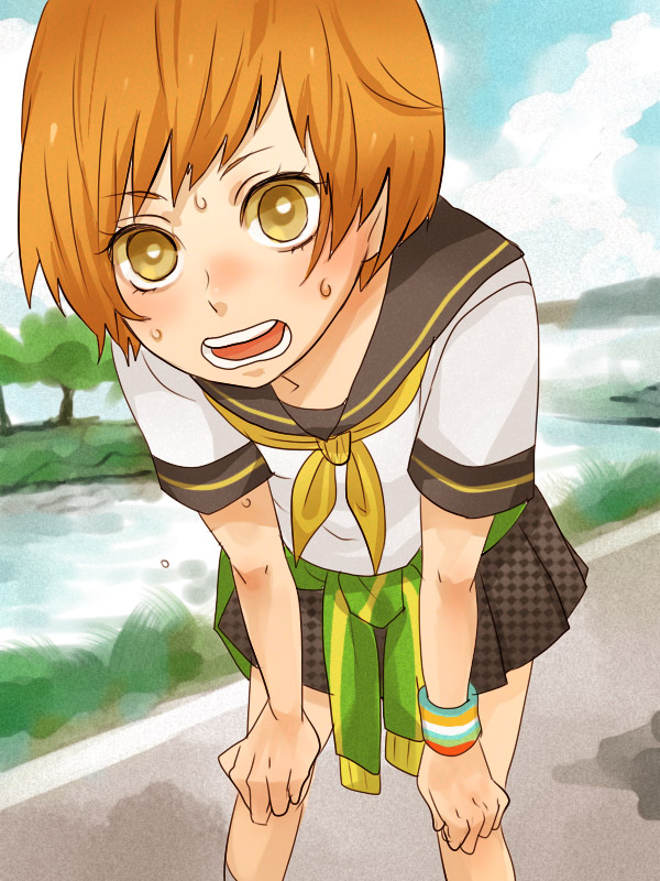 1girlarm supportbent overblushbrown hairclothes around waistclouddayfemale focusforeshorteningheavy breathingleaning forwardnatureorange hairoutdoorsriverroadschool uniformserafukushort hairsolostreetsweatsweatbandsweatersweater around waisttomboywristbandyellow eyes