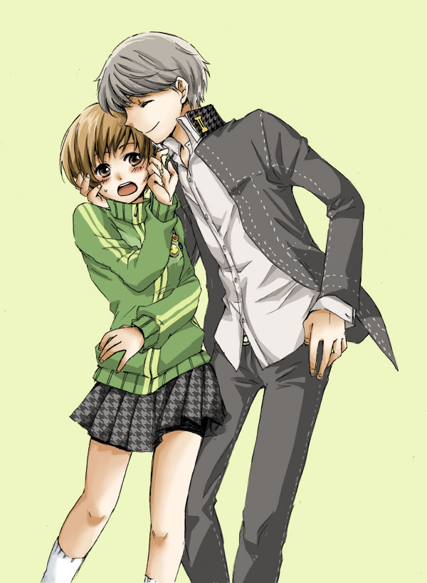 1boy1girlbadgeblouseblushbrown eyesbrown hairclosed eyescollared shirtcoupleembarrassedgreen backgroundgrey hairhand on another's headhand on own hipheterohip focushugschool uniformshirtshort hairsimple backgroundsockssweatdroptomboywhite shirt