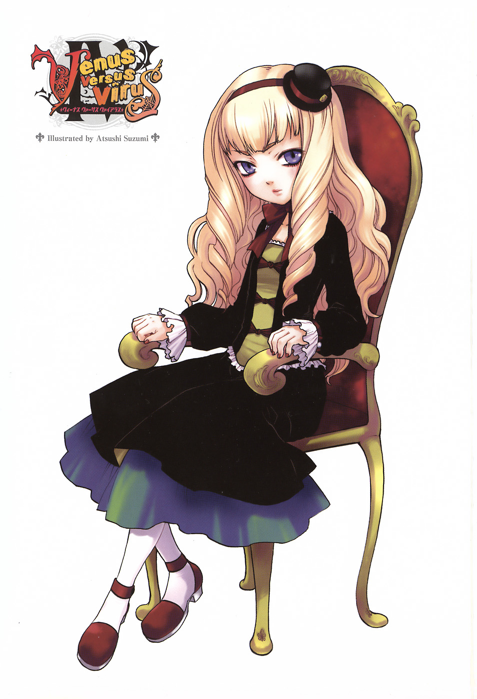 00sblonde hairblue eyeschairdressenglish textfull bodygoth fashionhatlong hairribbonserioussitting