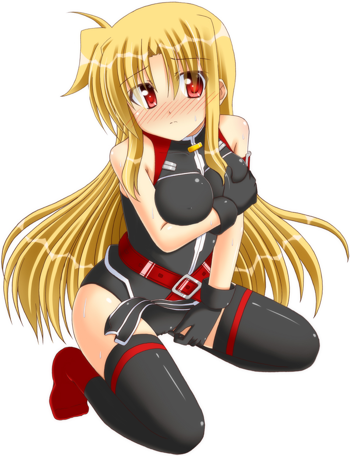 00s1girlbare shouldersbeltblonde hairblushbreastsfemale focusgloveslarge breastslong hairred eyessolothighhighs