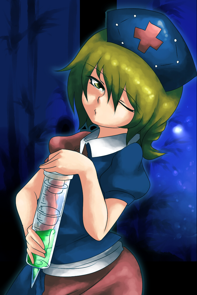 1girlblonde haircosplayfemale focushatlarge syringenurse capone eye closedoversized objectshort hairsolosyringewinkyagokoro eirin (cosplay)