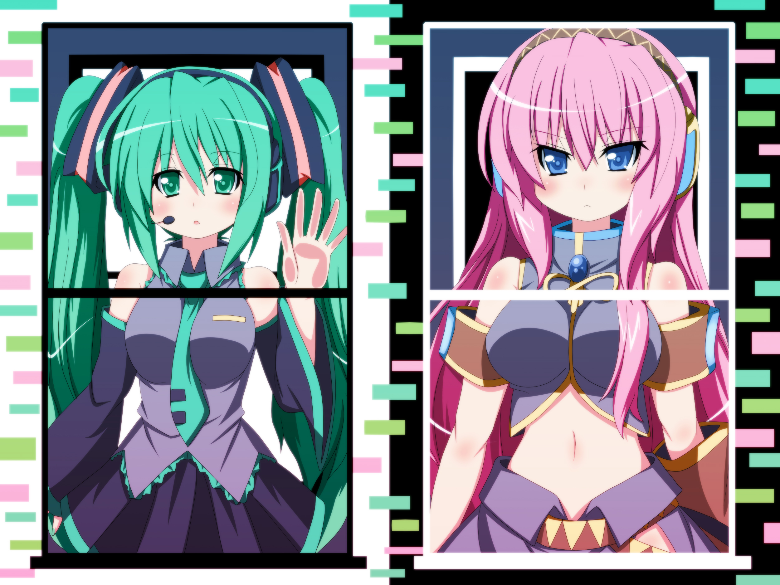 blue eyesdetached sleevesgreen eyesgreen hairheadsetlong hairmidriffnail polishnavelnecktiepink hairtwintails
