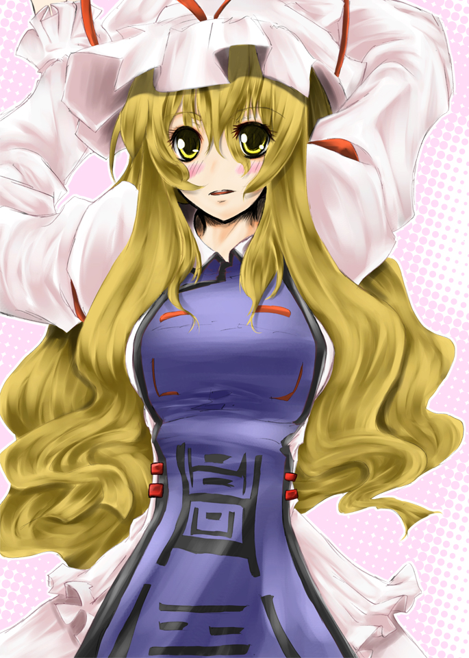 1girlblonde hairblushbreastsdressfemale focushalftonehalftone backgroundhatlong hairsolowhite backgroundyellow eyes