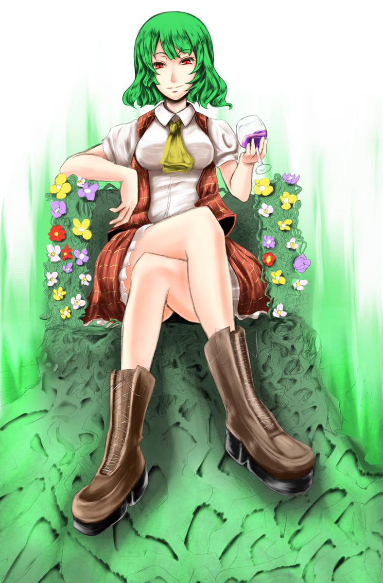 1girlalcoholascotbootsbreastscrossed legscupcupping glassdrinking glassfemale focusflowerglassgreen hairlace-up bootslarge breastsplaid clothesplaid skirtplaid vestred eyesshort hairsittingskirtskirt setsmilesmirksolothronevestwinewine glass