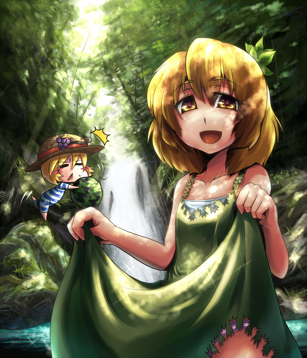 2girlsblonde hairclothes liftdaydressdress liftfemale focusfoodfruithair ornamenthatlacelace trimlace-trimmed pantiesleafleaf hair ornamentmultiple girlsone-piece swimsuitpantiespurple pantiesscenerysiblingssistersstriped clothesstriped one-piece swimsuitsundressswimsuitsymbol-shaped pupilsunderwearwaterwatermelon