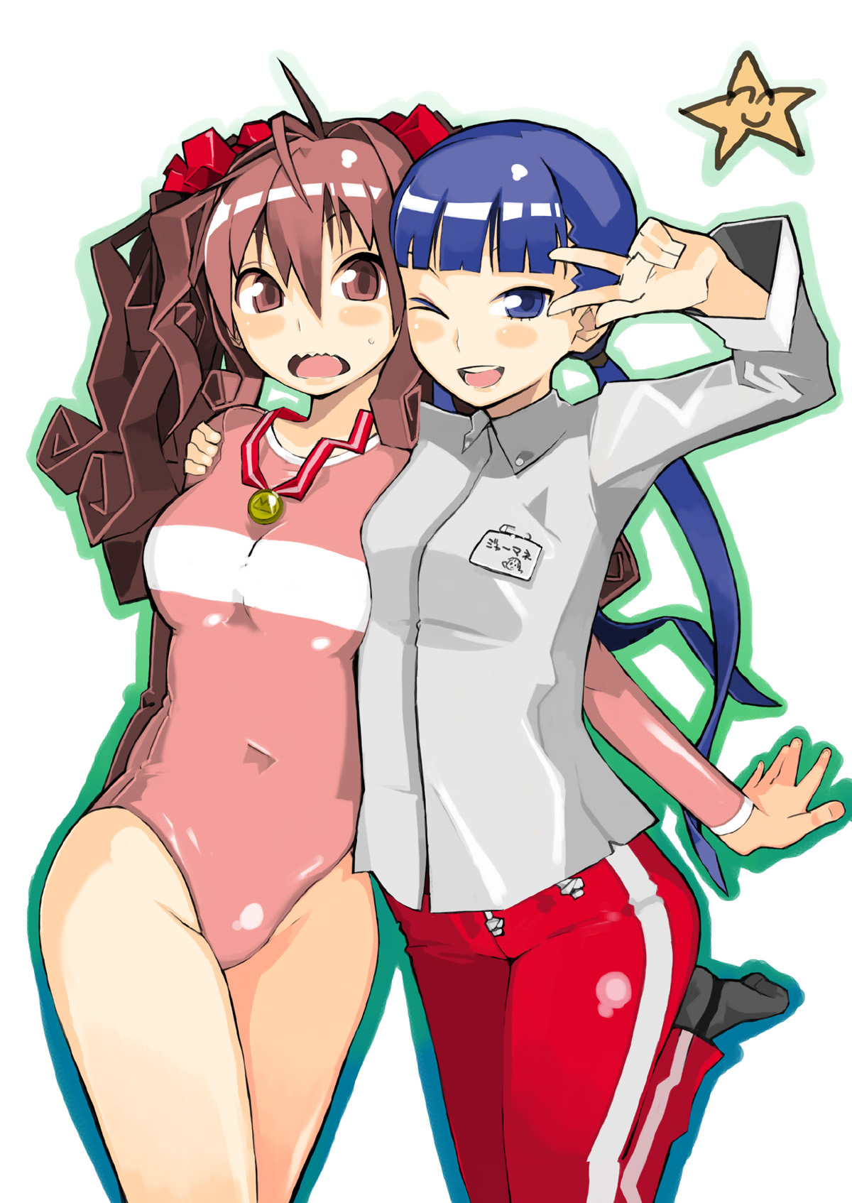 2girlsblue hairblushbrown hairhugleotardlong hairmedalmultiple girlsone eye closedopen mouthsharp teethsmilesocksteethtwintailsvv over eyewink