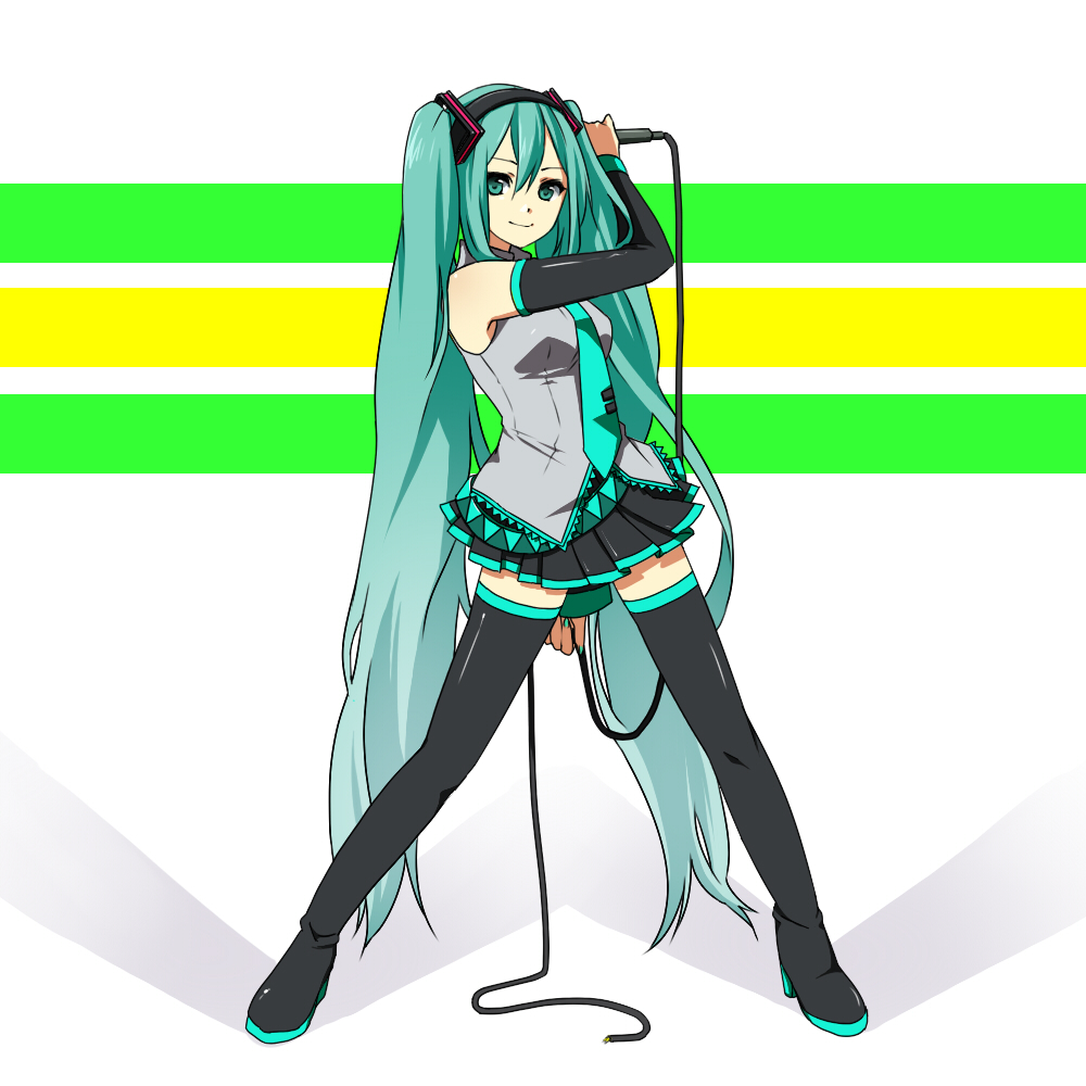 blue haircableelbow glovesglovesgreen eyeslong hairmicrophonenecktieskirtsolothighhighstwintailsvery long hairzettai ryouiki