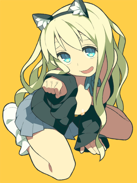 00s1girlanimal earsblonde hairblue eyesbreastsfemale focuskneelinglarge breastslong hairopen clothesopen shirtpaw poseschool uniformshirtskirtsockssolo