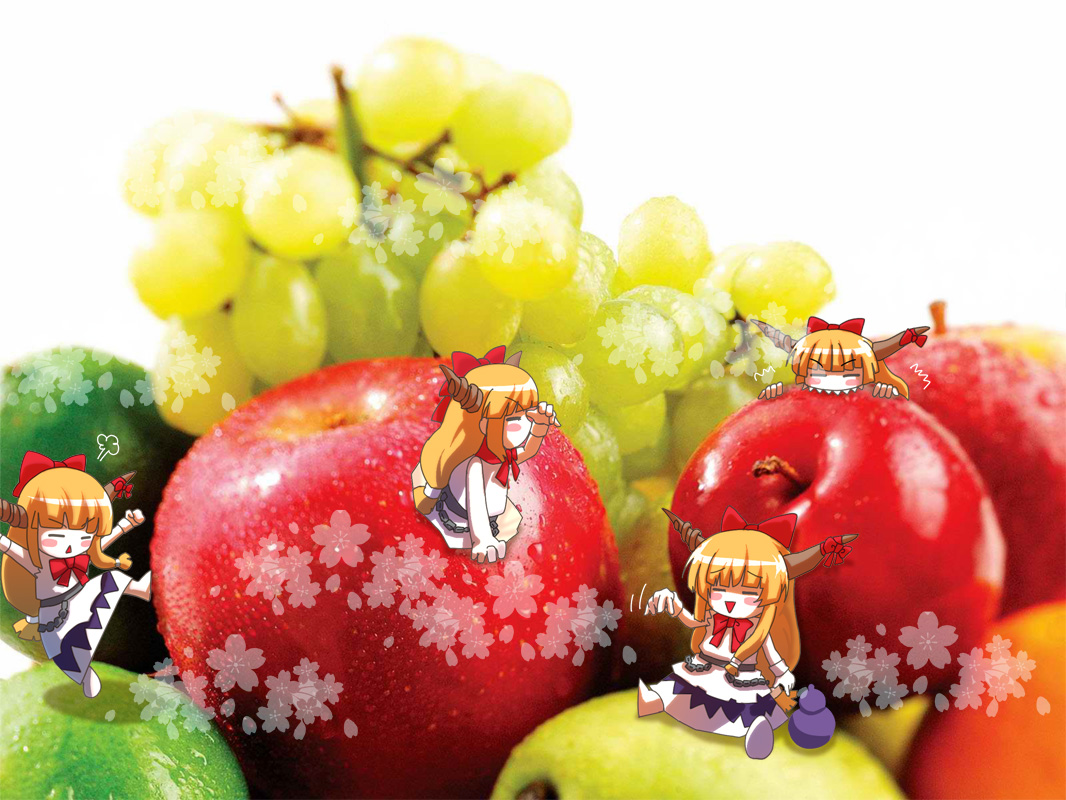 4girlsappleblushchibiclonedrunkeatingfemale focusfoodfruithornsin foodmini personminigirlmultiple girlsphoto background