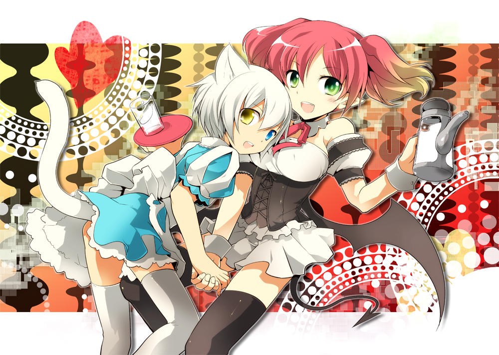 1boy1girlanimal earsbare shouldersblack thighhighscat earscat taildemon tailgreen eyesheteroheterochromiaholding handsmilkred hairshort hairtailthighhighstraptwintailswhite hairwhite thighhighswings