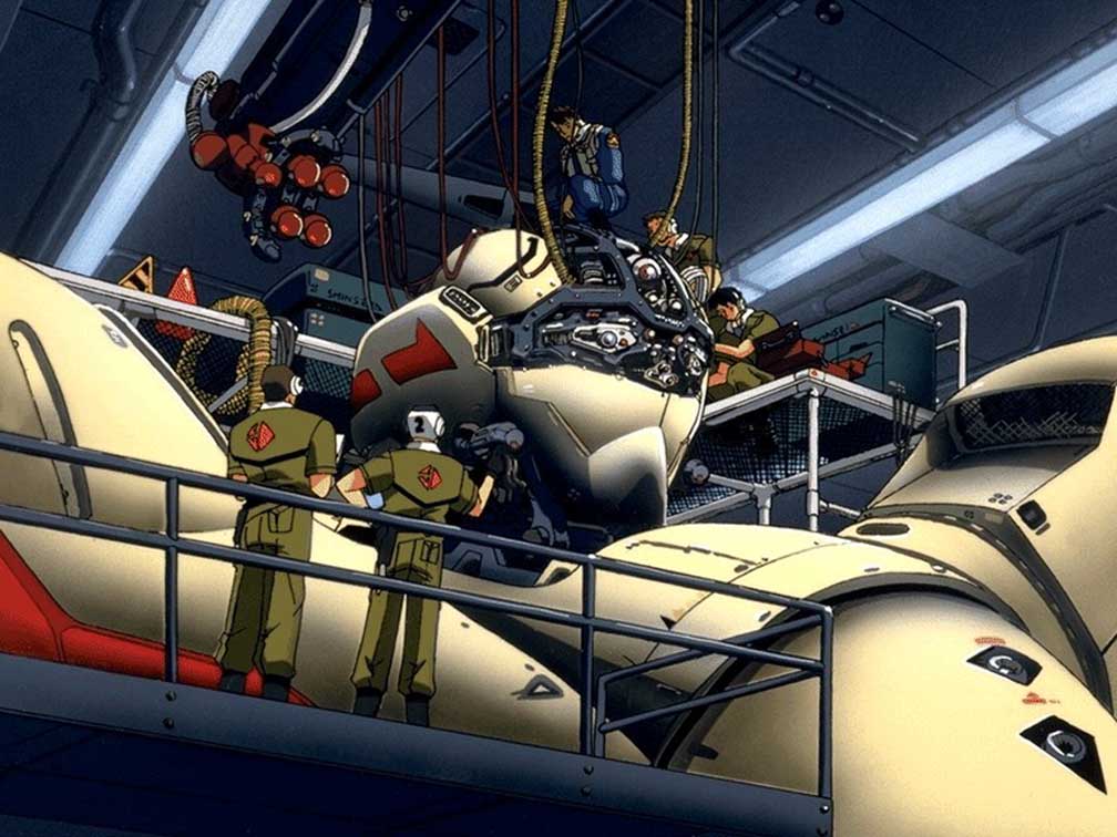 1990s (style)5boyshangarindoorslong sleevesmale focusmechamilitarymilitary uniformmultiple boysrailingretro artstylerobotsize differencestanding