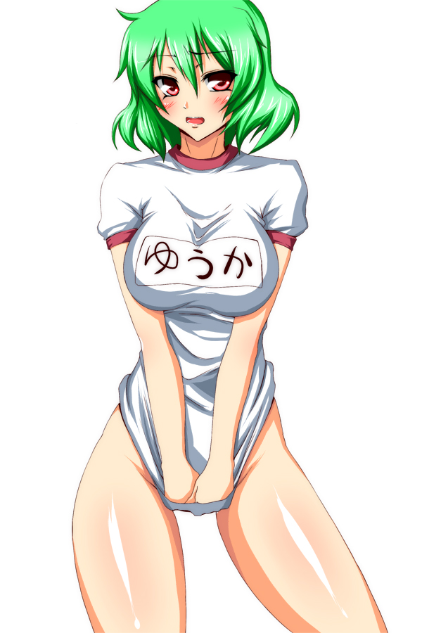 1girlalternate costumeblushbottomlessbreastscovering crotchcovering privatesembarrassedfemale focusgreen hairgym uniformlarge breastsno pantiesred eyesshirt tugsolo